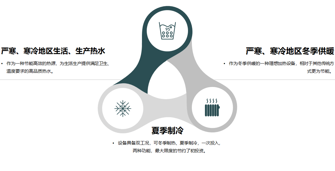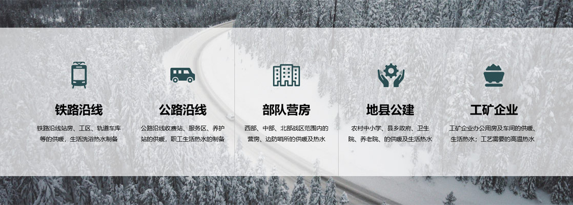 在嚴寒和寒冷地區(qū)作為集中供暖的補充方式,主要應用在項目偏僻,無法接入城市熱網(wǎng)、氣網(wǎng),但在冬季任然需要供暖的中小型項目
